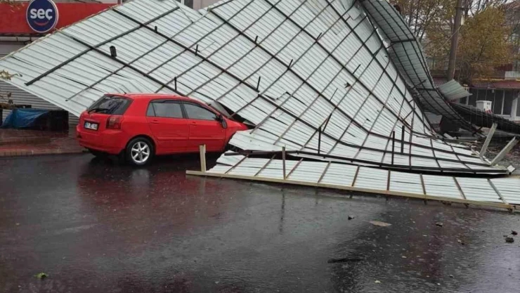 Zonguldak'ın Kilimli İlçesinde sağanak yağış ve fırtına nedeniyle, çatılar araçlar üzerine devrilirken, binalardan sökülen taşlar yollara düştü.