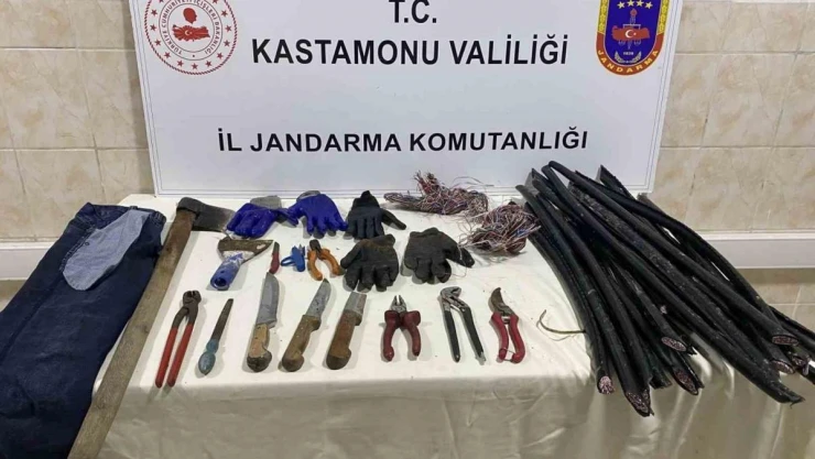 Edinilen bilgiye göre, Kastamonu İl Jandarma Komutanlığı ekiplerince Azdavay ilçesinde şüphe üzerine durdurulan araç içerisinde arama yapıldı. Yapılan aramada 21 adet 90 santimetre ebadında enerji nakil kablosu, 2 top soyulmuş kablo, 3 adet bıçak, 2 adet pense, 1 adet bağ budama makası, 1 adet demir törpüsü, 1 adet kerpeten, 1 adet yan keski, 1 adet balta ve 1 adet spatula ele geçirildi.