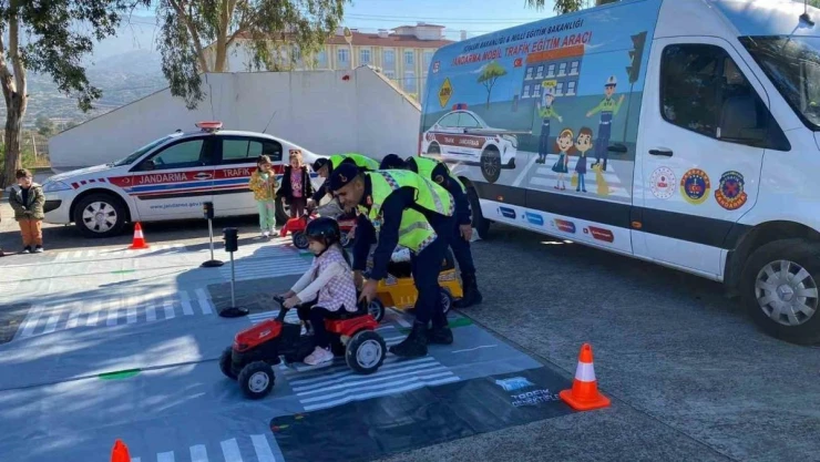Aydın’ın Çine ilçesinde anaokulu öğrencilerine jandarma tarafından verilen trafik eğitimlerinde, minikler hem eğlendi hem de uygulamalı olarak trafik kurallarını öğrendi.