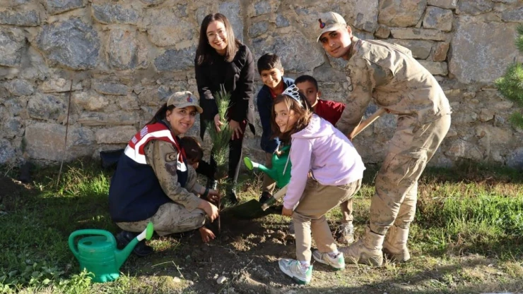 Hakkari İl Jandarma Komutanlığı personeli, çocuklarla el ele vererek fidan dikip hayvan besledi.