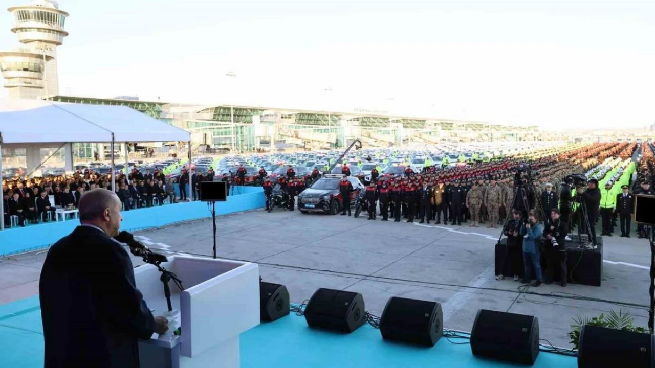 6 bin 992 polisin göreve başlaması ile bin 573 yeni aracın hizmete alım töreni Atatürk Havalimanı’nda gerçekleştirildi. Törende konuşma yapan Cumhurbaşkanı Erdoğan, bugünkü atama ve araç takviyesiyle İstanbul Emniyeti’nin Avrupa ülkelerinin ordularından daha büyük insan gücüne ulaştığını belirterek, “İstanbul’da görev yapan emniyet teşkilatı mensubu sayımız 56 bin 607’ye, araç sayımız da 8 bin 894’e yükseliyor. Hem personel hem araç bakımında güçlenen İstanbul emniyetimiz, dünyanın en büyük ve önemli metropollerinden olan şehrimize daha iyi hizmet edecektir. Temelini önümüzdeki aylarda atacağımız Hasdal’daki yeni binasına taşınmasıyla İstanbul emniyetimizin hizmet kalitesinin inşallah daha da yükseleceğine inanıyorum. İstanbul Emniyet Müdürlüğümüzün terörle, uyuşturucuyla, organize suç örgütleriyle, göçmen kaçakçılığıyla mücadelede gösterdiği başarıları yakından takip ediyoruz. Pek çok ülkenin nüfusundan daha fazla sayıda insanın yaşadığı Avrupa’nın, Asya’nın ve Afrika’nın kavşak noktası olan İstanbul’un güvenliği bizim için hayati öneme sahiptir. Bugünkü atamalar ve araç takviyesiyle İstanbul emniyetimiz Avrupa ülkelerinin tamamının bırakınız polisini, ordularından bile neredeyse daha büyük bir insan gücüne ulaşmıştır. Konumuyla, güzellikleriyle, ticaretiyle, turizmiyle ülkemizin kalbi mesabesindeki İstanbul’un huzurunu güvence altına almak için ne yapsak azdır" dedi.