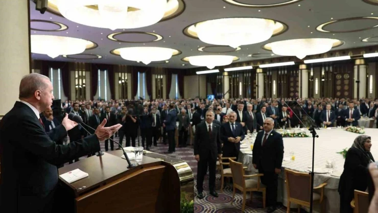 Muhtarlara hitap eden Cumhurbaşkanı Erdoğan,”Sizlerden muhtarlarımız olarak bu hakikatleri bu ihanetleri, bu çarpıklıkları kimi muhalefet aktörlerinin içine düştükleri bu gaflet hallerini kendi köylerinizde, kendi mahallelerinizde oturan vatandaşlarımıza mutlaka anlatmanızı bekliyorum. Şayet meydanı bu kifayetsiz muhterislere bırakırsak bunun vebalini hiçbirimiz ödeyemeyiz. Kardeşlerim ülkemizin tek derdi, tek sıkıntısı terörle mücadele olsa kahraman güvenlik güçlerimiz ile milletimizin birlik ve beraberliği sayesinde bunun üstesinden geleceğimizden hiçbir şüphemiz yoktur. Ama coğrafyamızın bize dayattığı başka sınamalarla da karşı karşıyayız. Deprem gibi tabii afetlerle iklim değişikliği gibi küresel sorunlar bunlardan biridir. Siyasi, ekonomik ve askeri bağımsızlığımızı korumak, bunlardan biridir. Milli Birlik ve beraberliğimize yönelik tehditlere karşı tek yürek, tek bilek halinde karşı durmak bunlardan biridir. Hamdolsun. Türkiye tüm bu mücadeleleri aynı anda yürütebilecek güce, iradeye, imkana kararlılığa sahiptir. Her fırsatta altını çizerek tekrar tekrar belirttiğim gibi diğer alanlardaki meşguliyetlerimiz ne olursa olsun gündemimizin değişmez ilk konusu ülkemizi depreme karşı hazırlama çalışmalarımızdır. Bir yandan altı Şubat depremlerinde yıkılan şehirlerimizi ayağa kaldıracak, inşa ve ihya faaliyetlerini hızla sürdürürken diğer yandan da deprem tehdidi altındaki şehirlerimizi güçlendirme çalışmalarını yürütüyoruz. Yüzyılın dönüşümü İstanbul programı da bu anlayışla hayata geçirdiğimiz projelerden biridir” diye konuştu.