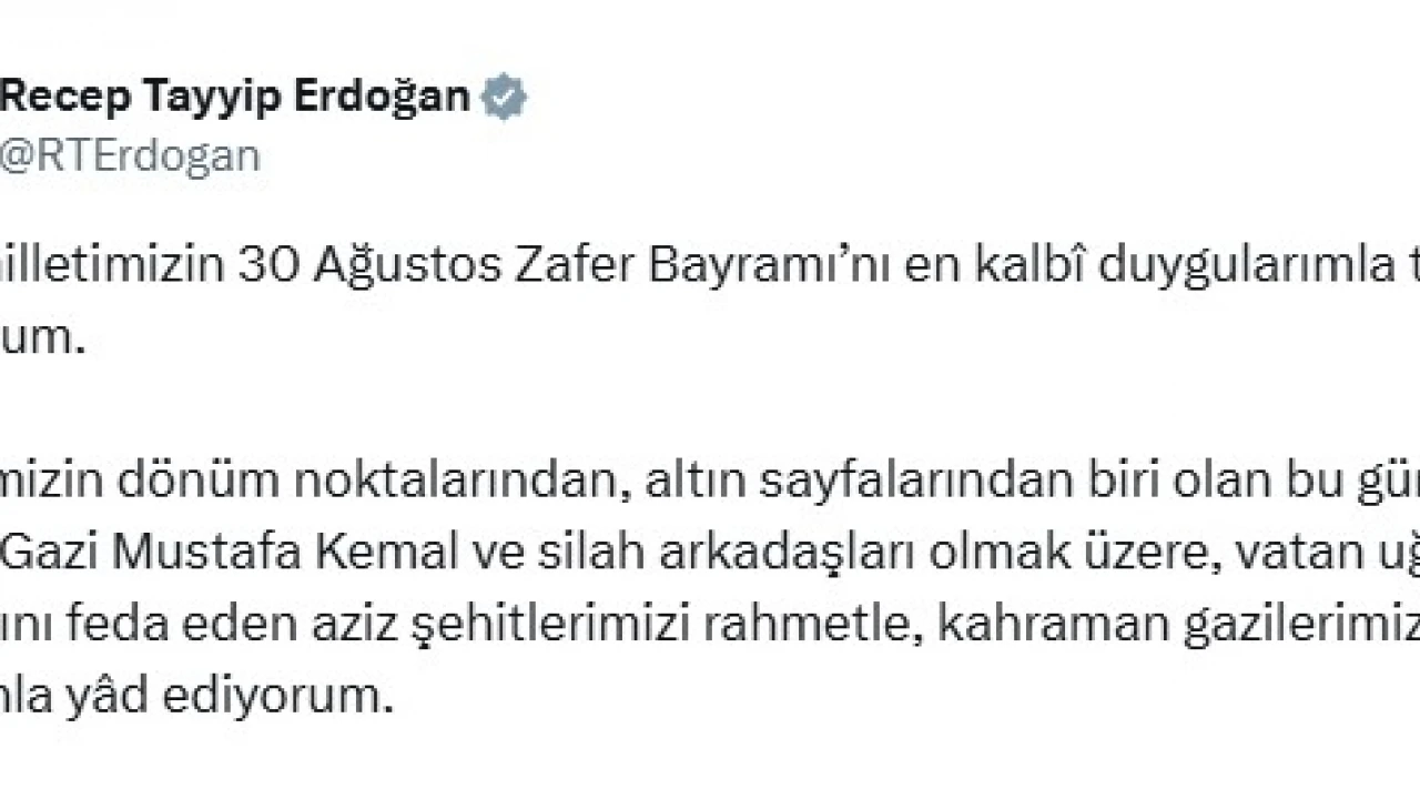 Cumhurbaşkanı Recep Tayyip Erdoğan, "Tarihimizin dönüm noktalarından, altın sayfalarından biri olan 30 Ağustos Zafer Bayramı’nın gurur ve coşkusunu, milletçe bir kez daha yaşamanın mutluluğu içindeyiz. Bu aziz gün, Türk milletinin hürriyet ve istiklâl uğruna ortaya koyduğu eşsiz iradenin, sarsılmaz inancın ve kahramanlığın en güçlü nişanelerinden biridir" dedi.