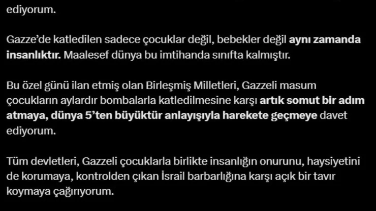Cumhurbaşkanı Recep Tayyip Erdoğan, Birleşmiş Milletleri, Gazzeli masum çocukların aylardır bombalarla katledilmesine karşı artık somut bir adım atmaya, dünya 5'ten büyüktür anlayışıyla harekete geçmeye davet ediyorum. Tüm devletleri, Gazzeli çocuklarla birlikte insanlığın onurunu, haysiyetini de korumaya, kontrolden çıkan İsrail barbarlığına karşı açık bir tavır koymaya çağırıyorum dedi.
