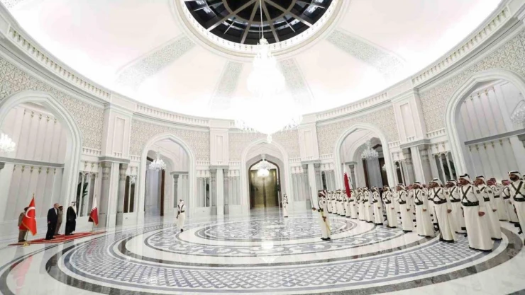Yüksek Stratejik Komite’nin 9’uncu toplantısına ve Körfez İş Birliği Konseyi 44. Zirvesi’ne katılmak üzere Katar’a gelen Cumhurbaşkanı Recep Tayyip Erdoğan, temaslarına başladı. Cumhurbaşkanı Erdoğan, Lusail Sarayı’nda Katar Emiri Şeyh Tamim bin Hamad Al Thani tarafından resmi törenle karşılandı. Cumhurbaşkanı Erdoğan ve Al Thani’nin tören alanındaki yerlerini almasının ardından iki ülke milli marşları çalındı. Al Thani ile tören kıtasını denetleyen Cumhurbaşkanı Erdoğan, askerleri selamladı. Cumhurbaşkanı Erdoğan ve Al Thani, baş başa gerçekleştirdikleri görüşmenin ardından Türkiye-Katar Yüksek Stratejik Komite’nin 9’uncu toplantısına katıldı. Ortak anlaşmaların imzalanmasının ardından Cumhurbaşkanı Erdoğan, Al Thani tarafından onuruna verilecek resmi yemeğe katılacak.