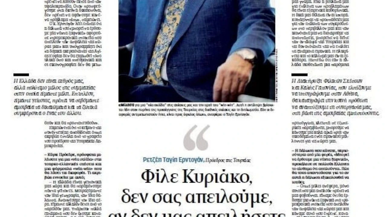 Cumhurbaşkanı Recep Tayyip Erdoğan, Atina ziyareti öncesinde Yunan Kathimerini gazetesine verdiği röportajda, “Kiryakos, dostum, siz bizi tehdit etmedikçe biz de sizi tehdit etmiyoruz. Gel iki ülke arasındaki güveni sağlamlaştıralım” dedi.