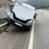 Kastamonu'nun Tosya ilçesi D100 karayolunda sürücüsünün direksiyon hakimiyetini kaybettiği hafif ticari araç çarptığı bariyerlerin üzerinde asılı kaldı.