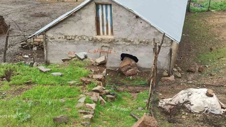Hakkari'nin Yüksekova ilçesinde yoğun yağışlar nedeniyle dağdan kopan kaya parçası ahırın duvarını deldi.