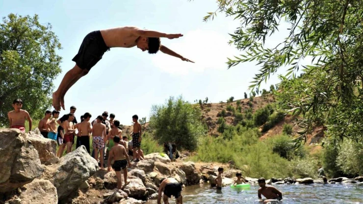 Elazığ'ın Arıcak ilçesindeki dağların eteğinde akan suda serinlemek isteyen çocukların profesyonel yüzücülere taş çıkartacak atlayışları fotoğraf karelerine yansıdı.