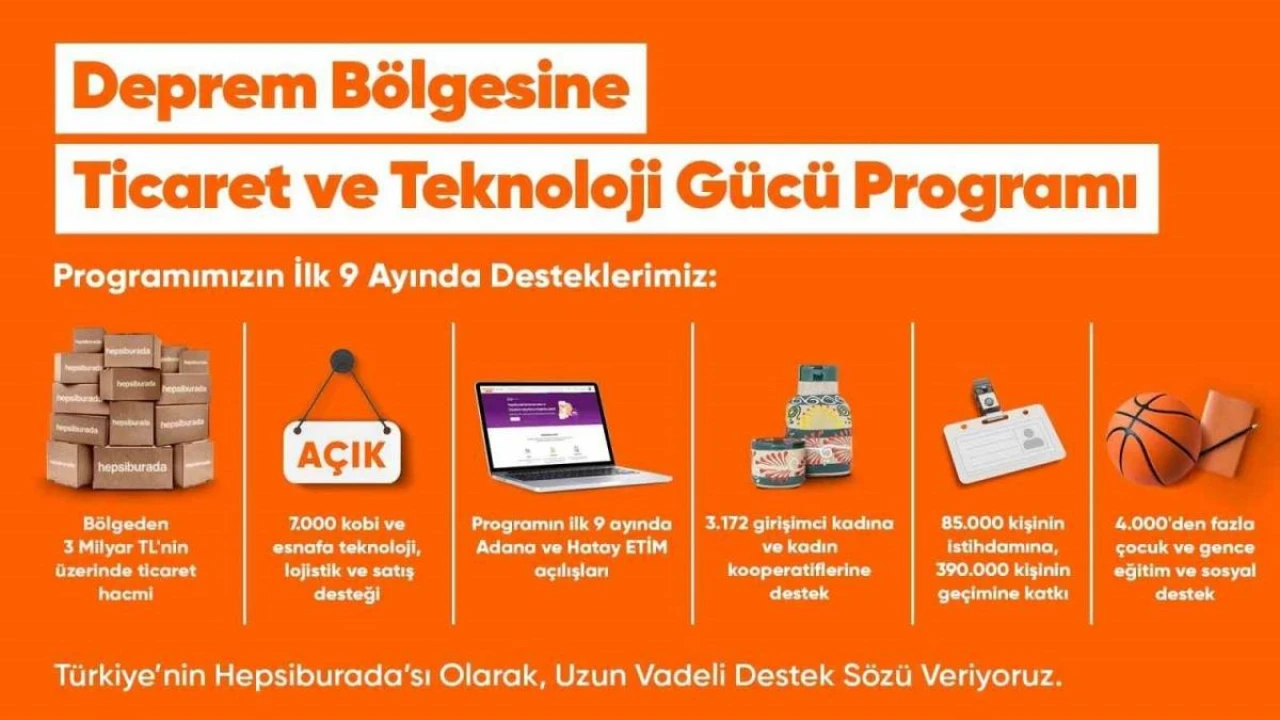Hepsiburada'nın, deprem bölgesinde kalıcı refahın tesisine katkı amacıyla mart ayında başlattığı 'Deprem Bölgesine Ticaret ve Teknoloji Gücü' programının 9 aylık sonuçlarına göre, bölgedeki KOBİ ve esnafın e-ticaret platformu üzerinden ticaret hacmi 3 milyar TL oldu.