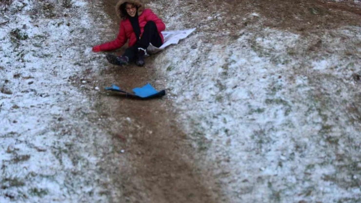 Karın tadını çıkaran 8 yaşındaki Yiğit İsmail Çam, "Kar topu oynadım ve kaydım. Karnem çok iyiydi. Annem ve babam beni buraya getirdi" dedi.