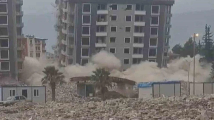 Depremin vurduğu Hatay'da dinamitle patlatılan 10 katlı bina kağıt gibi yerle bir oldu.