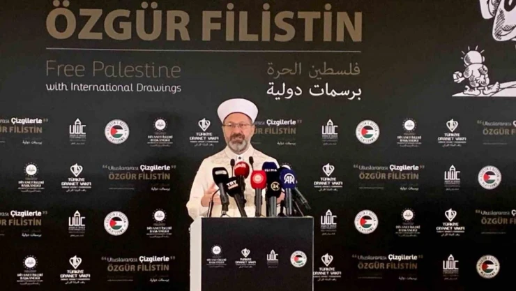 Uluslararası Çizgilerle Özgür Filistin” sergisiyle Gazze’de yaşanan soykırımı hem ulusal hem de uluslararası düzeyde dile getirerek toplumsal bir bilinç oluşturmanın amaçlandığını söyleyen Ali Erbaş, “Serginin Filistinli kardeşlerimizin haklı özgürlük mücadelesinin tercüman olacağına inanıyorum. Tüm mazlumların zalimlere karşı direnenlerin; vatanı, dini, milleti için mücadele verenlerin duygularını dile getireceğini düşündüğüm serginin hayırlara vesile olmasını yüce Rabbimden niyaz ediyorum. Sanat, insanla birlikte var olmuş. Şartlar ne olursa olsun çizgiler, şekiller ve renklerden oluşan eserleri marifetiyle insanoğlu kendini anlatma yolunu her zaman bulmuştur. Bir sanat eserini aynı zamanda ortaya koyulduğu döneme dair siyasi, sosyal, gündelik hayattan izler taşıyan o dönemi anlatan, yansıtan, aydınlatan bir vesika ve tarihe düşülen bir not olarak değerlendirmek gerekir. Yıllar sonra ’Çizgilerle Özgür Filistin’ için yapılmış olan bu eserleri gören insanlar Filistin davasını hatırlayacak, Kudüs davasını hatırlayacak. Sizin bu eserleriniz tarihe bir iz bırakacak inşallah” diye konuştu.