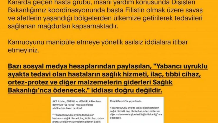 Cumhurbaşkanlığı İletişim Başkanlığı Dezenformasyonla Mücadele Merkezinin, sosyal medya hesabından yapılan açıklamada, "Bazı sosyal medya hesaplarından paylaşılan, ’Yabancı uyruklu ayakta tedavi olan hastaların sağlık hizmeti, ilaç, tıbbi cihaz, ortez-protez ve diğer malzemelerin giderleri Sağlık Bakanlığı’nca ödenecek’ iddiası doğru değildir. İddiaya konu 8438 sayılı Cumhurbaşkanı Kararının, kamuoyuna yansıtıldığı gibi ülkemizdeki mülteci ya da geçici koruma altındaki kişilerle bir ilgisi yoktur. Kararda geçen hasta grubu, insani yardım konusunda Dışişleri Bakanlığımız koordinasyonunda başta Filistin olmak üzere savaş ve afetlerin yaşandığı bölgelerden ülkemize getirilerek tedavileri sağlanan mağdurları kapsamaktadır. Kamuoyunu manipüle etmeye yönelik asılsız iddialara itibar etmeyiniz" ifadelerine yer verildi.