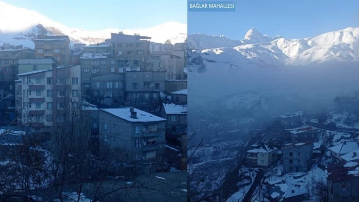 Hakkari'de sabah saatlerinde çekilen fotoğraf karesinde doğal gazlı ile doğal gazsız mahalleler arasındaki hava kirliliği farkı gözler önüne serildi.