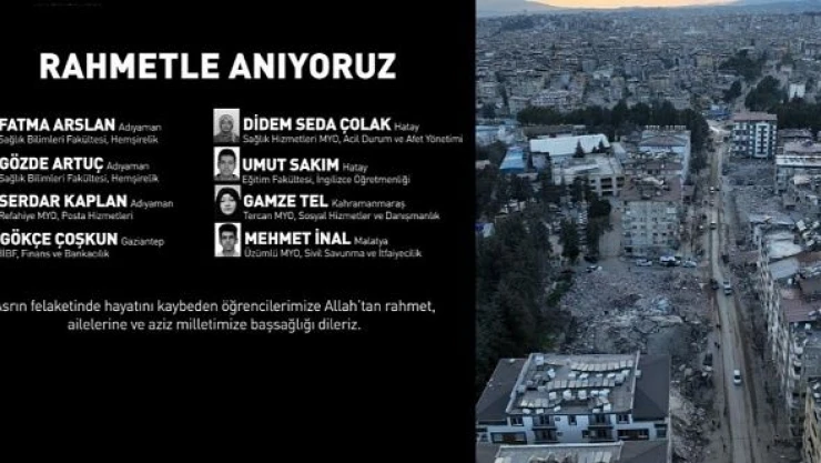 Üniversitenin sosyal medya hesabından yapılan açıklamada "Asrın felaketinde hayatını kaybeden öğrencilerimize Allah’tan rahmet, ailelerine ve aziz milletimize başsağlığı dileriz." denildi.