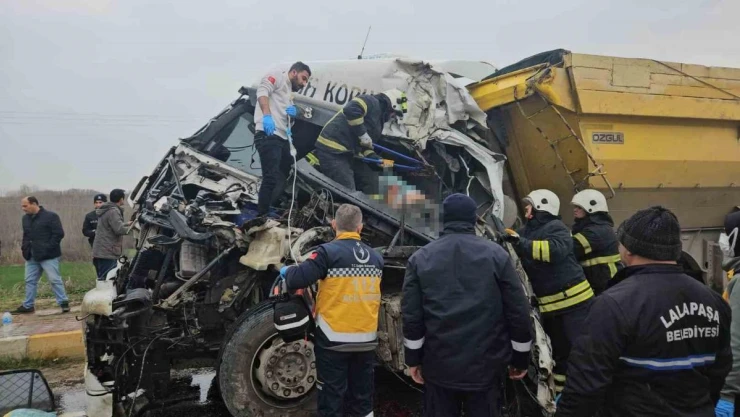 Edirne'nin Lalapaşa ilçesinde iki hafriyat kamyonunun çarpışması sonucu meydana gelen kazada bir sürücü araç içinde sıkışarak hayatını kaybetti.