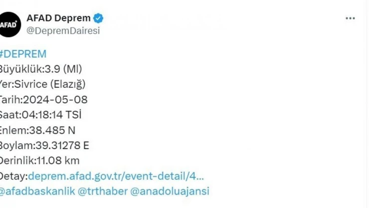 AFAD’dan yapılan açıklamada merkez üssü Sivrice ilçesinde saat 04.18’de yerin 11 kilometre altında 3.9 büyüklüğünde deprem meydana geldiği belirtildi. Depremde herhangi bir olumsuzluğun meydana gelmediği kaydedildi.