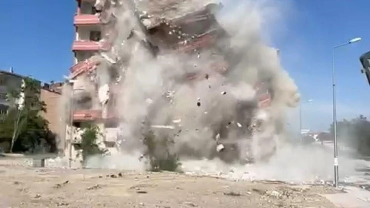 Elazığ'da ağır hasarlı bina, tek dokunuşla yerle bir oldu