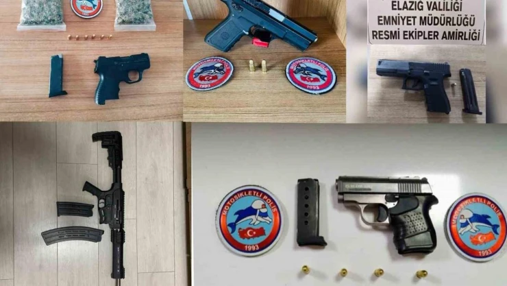 Elazığ'da polis ekipleri tarafından yapılan asayiş şok uygulamasında, 4 adet ruhsatsız tabanca, bir tüfek ve bir miktar uyuşturucu madde ele geçirildi.