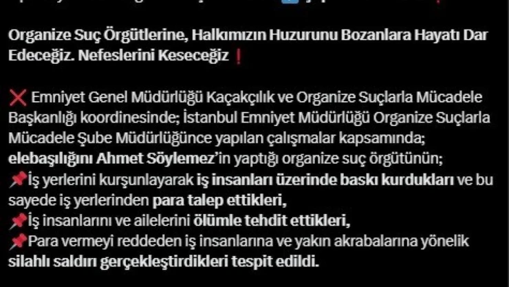 İçişleri Bakanı Ali Yerlikaya, sosyal medya hesabından yaptığı açıklamada organize suç örgütleriyle sonuna kadar mücadele edileceğini vurgulayarak, “İstanbul merkezli Ankara, Diyarbakır ve Mersin’de eş zamanlı olarak gerçekleştirilen ’Kafes-33’ operasyonlarında elebaşılığını Ahmet Söylemez’in yaptığı organize suç örgütü çökertildi. Operasyonlarda örgüt elebaşı ile birlikte 9 şüpheli yakalandı. İş yerlerini kurşunlayarak iş insanları üzerinde baskı kurdukları ve bu sayede iş yerlerinden para talep ettikleri, iş insanlarını ve ailelerini ölümle tehdit ettikleri, para vermeyi reddeden iş insanlarına ve yakın akrabalarına yönelik silahlı saldırı gerçekleştirdikleri tespit edildi” dedi.