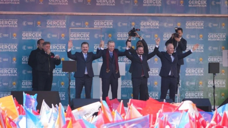İstanbul’da bir komedi yaşandığını dile getiren Erdoğan, "İstanbul’da yaşanan komediyi görüyorsunuz değil mi? Takip ediyorsunuz. Kaybedeceklerini görünce panikle sağa sola saldırmaya başladılar. Birileri ‘Son dakikaya kaldık, aday listelerini yetiştiremedik’ numarasıyla kendi akıllarınca milleti kandırmaya çalışıyor. Neyse ki milleti kandırmak isterken bile işlerini doğru dürüst yapamıyorlar da oynadıkları oyunlar kendi ayaklarına dolanıyor. Muhalefet partilerindeki iç çekişmeler de ayrı bir facia. Kelimenin tam anlamıyla rezillik diz boyu. Muhalefetin belediye başkan adayları şehirlere hizmet edecek ismi bulma kriteriyle değil parti içi hiziplerin paylaşım aracı olarak belirleniyor. Biz İstanbul’da Murat Kurum, Ankara’da Turgut Altınok, İzmir’de Hamza Dağ, Balıkesir’de Yücel Yılmaz isimlerini aynı şekilde diğer yerlerdeki adaylarımızı belirlerken şehirlerimizin Türkiye Yüzyılı yürüyüşüne ayak uyduracak profiller olmasına dikkat ettik. İşte bu şekilde tespit ettiğimiz Cumhur İttifakı’mızın belediye başkan adaylarımızın verdiği her sözün arkasında biz varız. Cumhurbaşkanı var, hükümetimiz var, Cumhur İttifakı var" şeklinde konuştu.