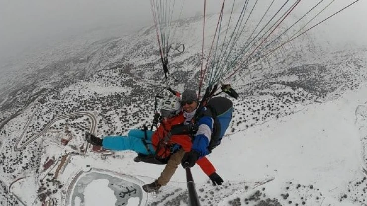 Ergan Dağı'nın 2 bin 700 rakımına yamaç paraşütü ile gelen doğa ve adrenalin tutkunu baba Sedat Cengiz ile kızı Kübra, burada hazırlıklarını tamamlayarak tandem (ikili) yamaç paraşütü ile havalandı. Aynı zamanda hem yamaç paraşütü hem de kayak yapmanın keyfini çıkaran baba kız, aktivitelerini, kaskın üzerinde bulunan aksiyon kamerasıyla saniye saniye kaydetti.