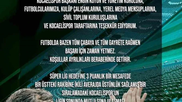 Ertuğrul Sağlam Kocaelispor'a böyle veda etti: 'Tüm çabaya ve gayrete rağmen başarı için zaman yetmez'