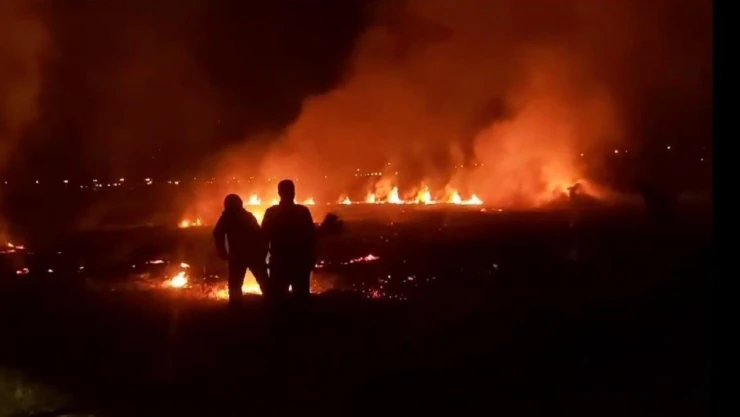 Erzincan’da boş arazide çıkan anız yangını geceyi aydınlatırken itfaiye ekiplerinin müdahalesiyle söndürüldü.