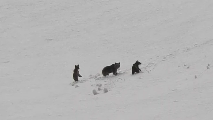 Erzincan'da anne ayı ve yavruları karlı arazide dolaşırken görüntülendi