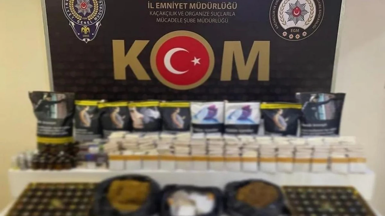 3 işyeri ve eklentisinde yapılan aramada; 7 bin 820 adet (dal) içine tütün doldurulmuş makaron, 7 adet elektronik sigara likiti, 1 adet elektronik sigara, 101 adet 50 gramlık nargile tütünü, 28 paket sigara ve 10,5 kilogram kıyılmış tütün ele geçirildi.