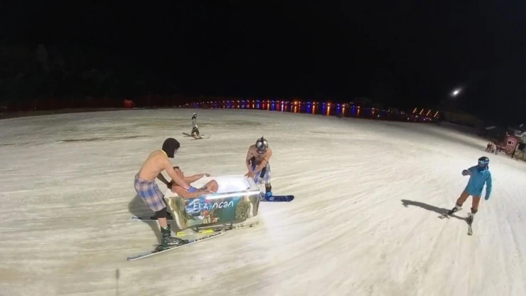 Erzincan'da bulunan Ergan Dağı Kayak Merkezi'nin pistinde yapılan küvetle sıra dışı kayak ilginç görüntü oluşturdu.