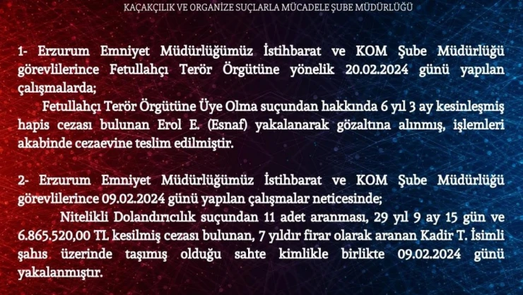 Ayrıca Erzurum Emniyet Müdürlüğümüz İstihbarat ve KOM Şube Müdürlüğü görevlilerince yapılan çalışmalar neticesinde; Nitelikli Dolandırıcılık suçundan 11 adet aranması, 29 yıl 9 ay 15 gün ve 6 milyon 865 bin 520 TL kesilmiş cezası bulunan, 7 yıldır firar olarak aranan Kadir T. İsimli şahıs üzerinde taşımış olduğu sahte kimlikle birlikte yakalandı.