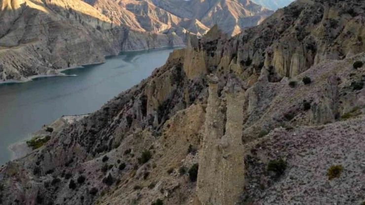 Erzurum'da Tortum Gölü kenarında bulunan ve Kapadokya'yı andıran peri bacaları benzeri oluşumlar görenleri adeta büyülüyor.