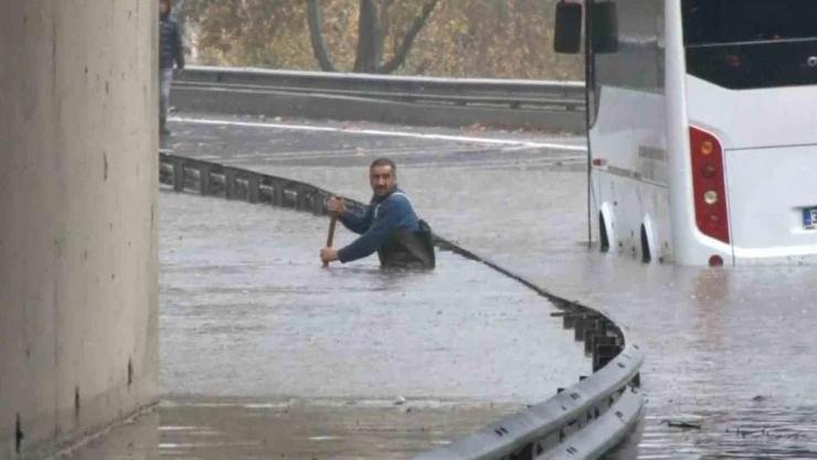 Esenler'de etkili olan sağanak yağış nedeniyle bir alt geçit adeta göle döndü. Bu sırada seyir halinde olan bir servis minibüsüyle otomobil suda mahsur kalırken, beline kadar suya giren bir işçi suyu tahliye edebilecek bir nokta aradı. O anlar kameraya yansıdı.