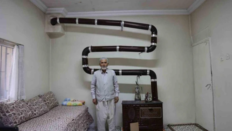 İnce, “Hava soğudu ve biz de yaşlandığımız için soğuk havalara dayanamıyoruz. Sobayı kurmadan kendi kafamdan duvarda çizgi çizdim. Gidip 700 liraya soba ve borularını aldım. Bu şekilde kurdum görenler de beğeniyor. Bir oda var ve odanın tamamı normal ısıda. Hanımın ayakları üşüyordu dayanamıyordu soğuğa onun için ben de böyle yaparsam ayakları soba borularına yakın olur düşüncesiyle üşümeyeceğini tahmin ettim ve soba borusunu bu şekilde taktım. Kendisi de ’eline sağlık çok güzel oldu’ diyor. Gelen misafirlerin de hoşuna gidiyor, ‘biz de yapalım’ diyenler var. Kömür, odun her şey yanıyor bacada tütme olmuyor” diye konuştu.