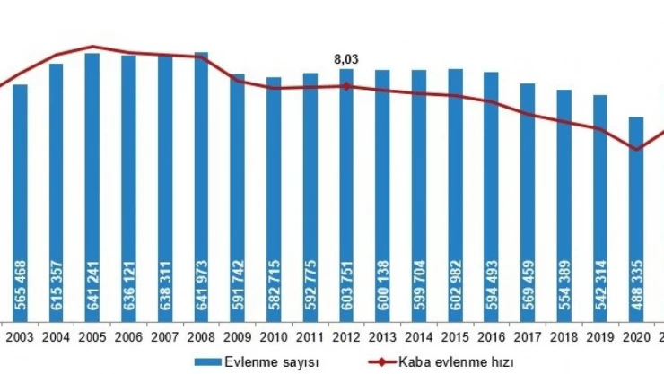 TÜİK hem Türkiye geneli hem de illerle ilgili 2023 yılına ait evlenme ve boşanma istatistiklerini paylaştı. Yayınlanan verilere göre, evlenen çiftlerin sayısı 2022 yılında 575 bin 891 iken, 2023 yılında 565 bin 435 oldu. Bin nüfus başına düşen evlenme sayısını ifade eden kaba evlenme hızı 2023 yılında binde 6,63 olarak gerçekleşti. Boşanan çiftlerin sayısı 2022 yılında 182 bin 437 iken, 2023 yılında 171 bin 881 oldu. Bin nüfus başına düşen boşanma sayısını ifade eden kaba boşanma hızı ise 2023 yılında binde 2,01 olarak gerçekleşti. Yıllara göre ortalama ilk evlenme yaşı incelendiğinde, her iki cinsiyette de ilk evlenme yaşının arttığı görüldü. Ortalama ilk evlenme yaşı 2023 yılında erkeklerde 28,3 iken kadınlarda 25,7 oldu. Erkek ile kadın arasındaki ortalama ilk evlenme yaş farkı ise 2,6 yaş olarak gerçekleşti.