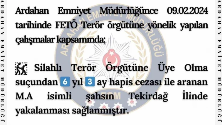 Hakkında FETÖ terör örgütü üyeliğinden 6 yıl 3 ay kesinleşmiş hapis cezası bulunan M.A. Ardahan Emniyetinin takibi sonucunda Tekirdağ’da yakalandı.