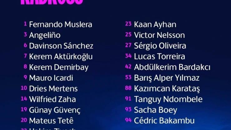 "Fernando Muslera, Angelino, Davinson Sanchez, Kerem Aktürkoğlu, Kerem Demirbay, Mauro Icardi, Dries Mertens, Wilfried Zaha, Günay Güvenç, Tete, Hakim Ziyech, Kaan Ayhan, Victor Nelsson, Sergio Oliveira, Lucas Torreira, Abdülkerim Bardakcı, Barış Alper Yılmaz, Kazımcan Karataş, Tanguy Ndombele, Sacha Boey ve Cedric Bakambu."