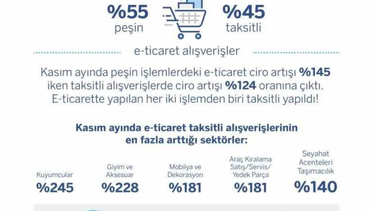 Araştırmaya göre, Kasım ayında peşin e-ticaret alışveriş cirosu yüzde 145 artış gösterirken, taksitli alışverişlerin cirosu da yıllık bazda yüzde 124 arttı. E-ticaret alışverişlerinin yüzde 55’i peşin yüzde 45’i taksitli yapıldı, diğer bir ifadeyle Kasım ayında yaklaşık her iki işlemden biri taksitli biri peşin olarak gerçekleşti.