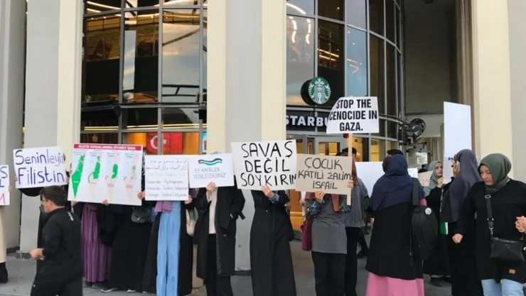 Kayseri Cumhuriyet Meydanı’nda bulunan bir AVM’nin zemin katındaki Starbucks kafenin önüne ellerinde pankart ve dövizlerle gelen genç kızlar, İsrail vahşetine destek olan Starbucks firmasını protesto etti. Bu duyarlılık karşısında bazı müşterileri de kafeyi terk etti.