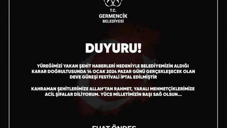 Milli Savunma Bakanlığı tarafından (MSB), Pençe-Kilit Harekatı bölgesinde bir üs bölgesinde sızmaya çalışan teröristlerle çıkan çatışmada 6 askerin şehit olduğu, 2’si ağır 7 askerin yaralandığını açıklandı. Germencik Belediye Başkanı Fuat Öndeş gelen acı haber üzerine 14 Ocak Pazar günü Germencik’te düzenlenmesi planlanan deve güreşi festivali iptal edildiğini açıkladı. Germencik Belediye Başkanı Fuat Öndeş, "Yüreğimizi yakan şehit haberleri nedeniyle belediyemizin aldığı karar doğrultusunda 14 Ocak Pazar Günü gerçekleşecek olan Deve Güreşi Festivali iptal edilmiştir. Kahraman şehitlerimize Allah’tan rahmet, yaralı Mehmetçiklerimize acil şifalar dilerim. Yüce milletimizin başı sağ olsun" ifadelerini kullandı.