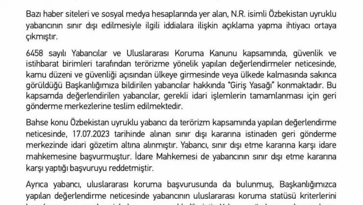 Göç İdaresi Başkanlığı, Özbekistan uyruklu N.R. isimli kişinin sınır dışı edilmesiyle ilgili iddialar hakkında yazılı açıklama yaptı. Yapılan açıklamada, "Bahse konu Özbekistan uyruklu yabancı da terörizm kapsamında yapılan değerlendirme neticesinde 17.07.2023 tarihinde alınan sınır dışı kararına istinaden geri gönderme merkezinde idari gözetim altına alınmıştır. Yabancı, sınır dışı etme kararına karşı idare mahkemesine başvurmuştur. İdare mahkemesi de yabancının sınır dışı etme kararına karşı yaptığı başvuruyu reddetmiştir" denildi.