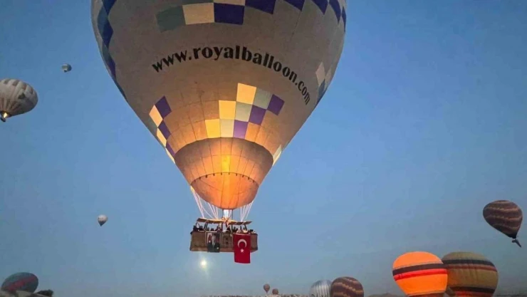 UNESCO Dünya Doğal ve Kültür mirası listesinde yer alan tarihi, kültürel ve doğal zenginlikleriyle tanınan turizm merkezi Kapadokya’da, yerli ve yabancı turistlere manzarayı gökyüzünden izlemelerine imkânı sunan sıcak hava balonlarının sepetlerine uçuş öncesi Türk bayrakları asıldı. Peş peşe havalanan 152 sıcak hava balonları, Göreme beldesi ve çevresindeki kalkış alanlarından gökyüzüne yükseldi.