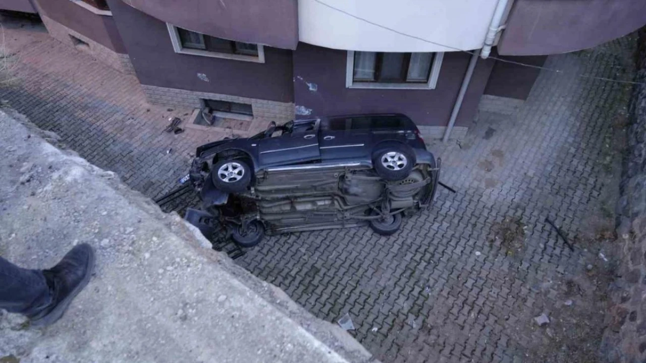 Gümüşhane'de sürücüsünün el frenini çekmeyi unuttuğu cip, yokuş aşağı hareket ederek 10 metrelik duvardan site bahçesine düştü. Kaza güvenlik kameralarına yansırken, aracı durdurmaya çalışan sürücü aşağı düşmekten son anda kurtuldu.