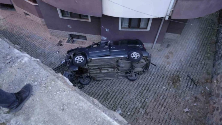 Gümüşhane’de sürücüsünün el frenini çekmeyi unuttuğu cip, yokuş aşağı hareket ederek 10 metrelik duvardan site bahçesine düştü. Kaza güvenlik kameralarına yansırken, aracı durdurmaya çalışan sürücü aşağı düşmekten son anda kurtuldu.