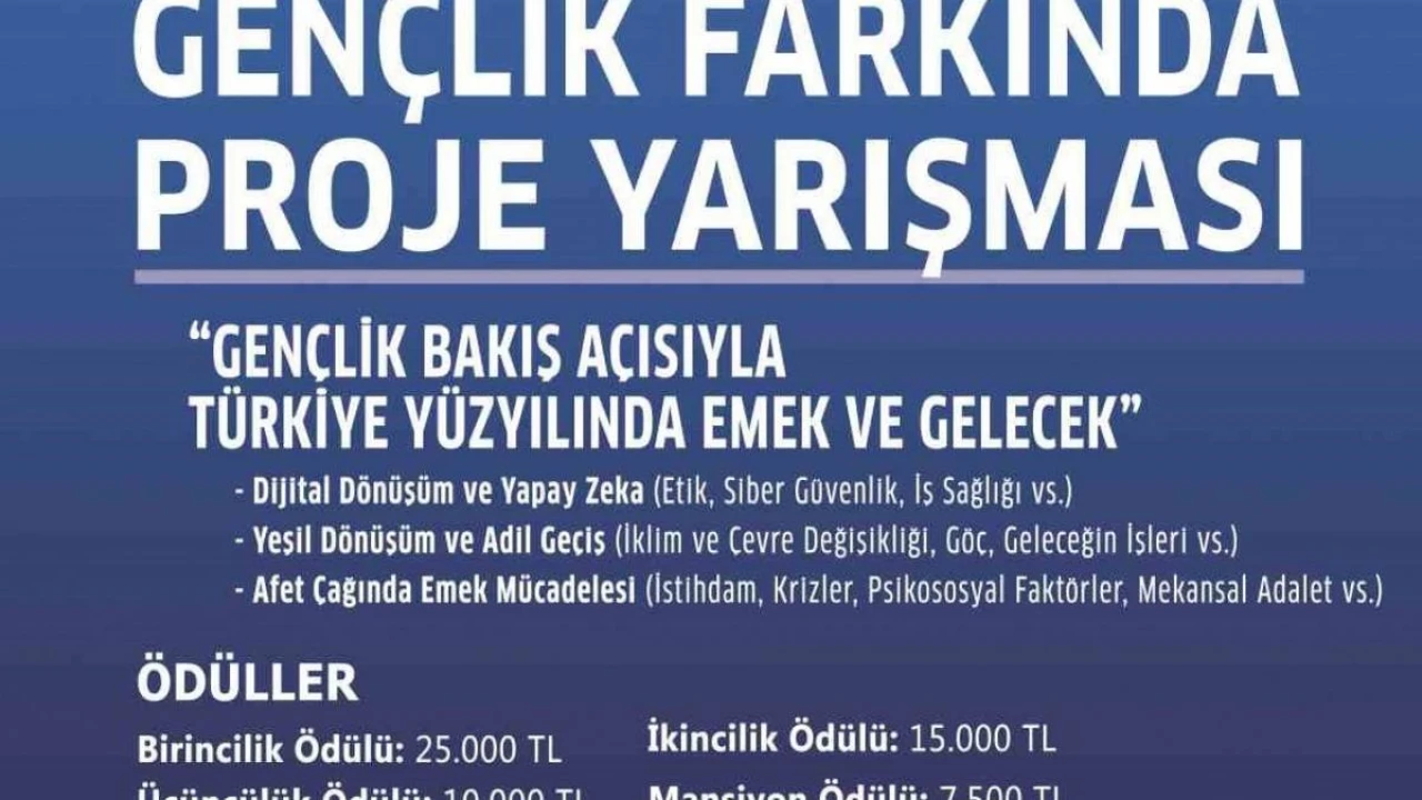 HAK-İŞ ile Ankara Sosyal Bilimler Üniversitesi işbirliğinde yapılan ‘Ulusal Gençlik Farkında Proje Yarışması’nın bu yıl 7’incisi düzenleniyor. Yarışmanın bu yılki teması Türkiye Yüzyılı vizyonu dikkate alınarak, ‘Gençlik bakış açısıyla Türkiye Yüzyılında emek ve gelecek’ olarak belirlendi. Türkiye Yüzyılında gençlerin emek ve gelecek konularında ortaya koyacakları fikirlerin değerlendirilmesi amacıyla düzenlenen yarışmada, dijital dönüşüm ve yapay zeka, yeşil dönüşüm ve adil geçiş ve afet çağında emek mücadelesi gibi konu başlıklarında projeler geliştirilmesi bekleniyor. Yarışmada birinci olan projeye 25 bin lira, ikinci projeye 15 bin lira, üçüncü projeye 10 bin lira, mansiyon ödülü olarak ise 7 bin 500 lira ödül verilecek. Dereceye giren proje sahiplerine HAK-İŞ Konfederasyonu’nda staj imkanı da sağlanacak. Yarışmaya Türkiye’de ve KKTC’deki üniversitelerde lisans ve lisansüstü eğitim öğren öğrenciler başvurabilecek. Başvurular Türkçe ve İngilizce olarak iki dilde kabul edilecek.
