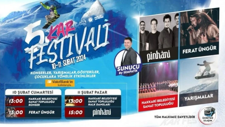 Hakkari’de 5. kar festivali hafta sonu başlıyor. 10-11 Şubat tarihlerinde düzenlenecek olan 5. kar festivali kent merkezinde 12 kilometre mesafede bulunan Mergabüte Kayak Merkezinde start verecek. Cumartesi günü saat 13:00’da Hakkari Belediyesi Sanat topluluğu konseri, saat 15:00 da Ferhat Üngür, 11 Şubat Pazar günü Hakkari Belediyesi Sanat Topluluğu Halk Dansları, saat 15:00 da Pinhâni sahne alacak.
