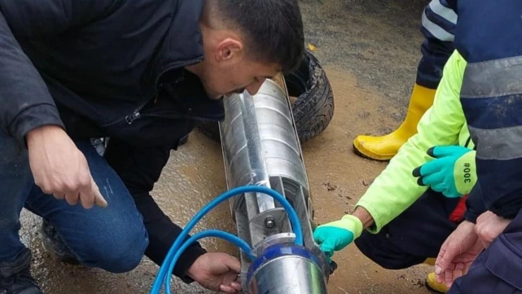 İş makinelerinin yardımı ile yerinde sökülen sondaj dalgıç pompası motoru iki günlük çalışmanın ardından tamir edildi. Olumsuz hava şartlarına rağmen iş makinelerinin yardımı ile sondaj dalgıç pompası motorunu yerine yerleştiren ekipler tarafından şehrin birçok noktasına yeniden su verildi.