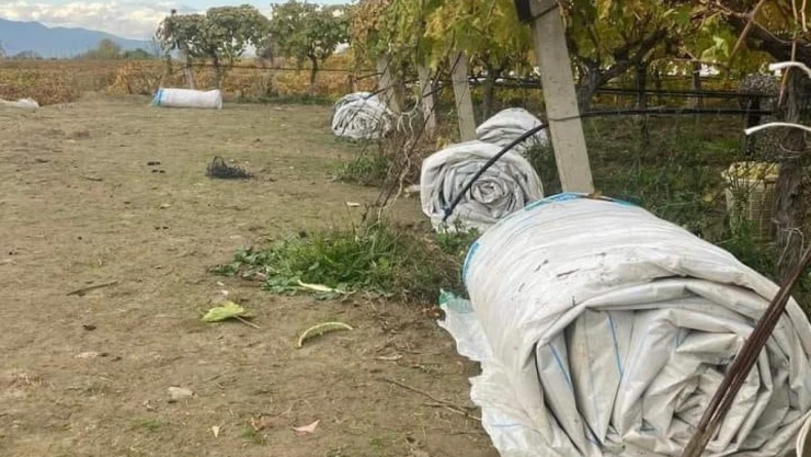 Temmuz ayında örtü altına alınarak iklim şartlarından korunan ve hasat dönemi aralık ayı sonuna kadar uzatılan Manisa'nın Sarıgöl ilçesinde hasadı biten üzüm bağlarında beyaz kanaviçe örtüler toplanmaya başladı.